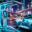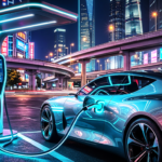 Electric car insurance concept with luxury EV and digital interface in modern city